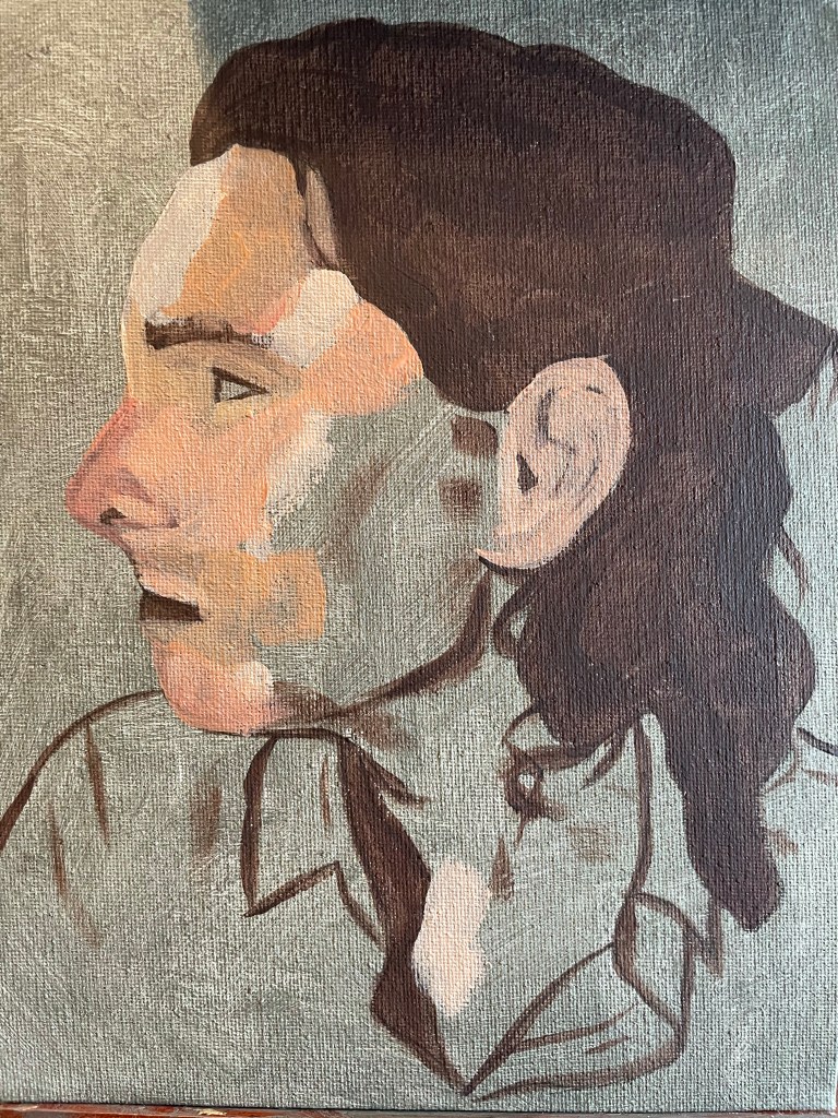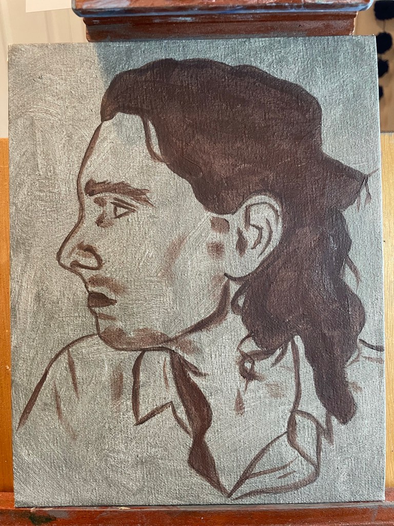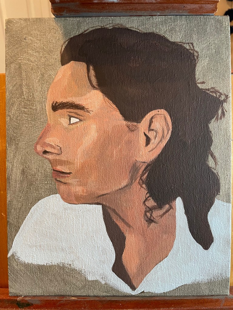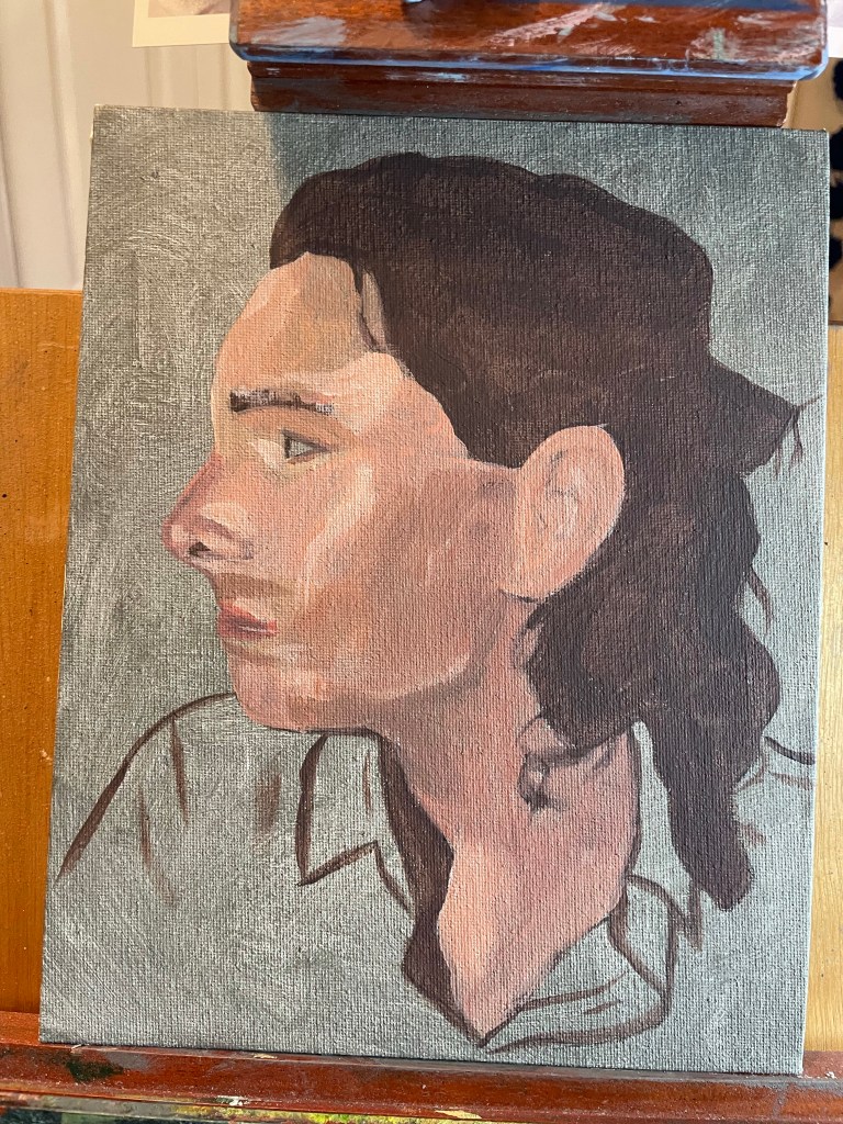 I decided to do a quick study of portrait painting. Reading some articles online and watching a couple of videos, I learned words like “underpainting” and also that I needed some more art supplies (any excuse will do). I went out and bought myself a glass palette and my very first palette knife – a dream tool I had never worked with.